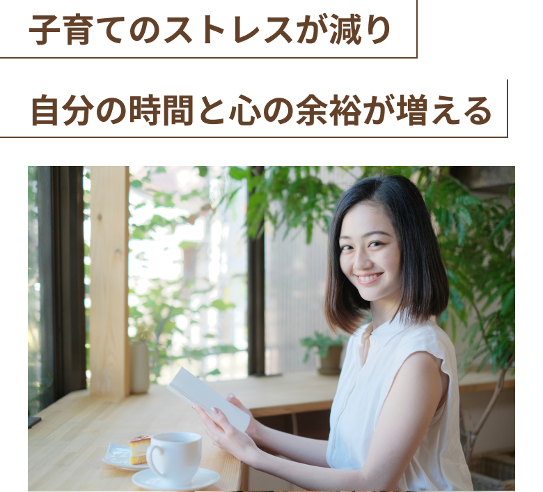 忙しい毎日の中でも、子育てに対するモヤモヤが減り、自分を取り戻す時間が生まれます。「自分もちゃんと頑張ってる」と思えることで心に余裕ができ、少しずつ家事や育児に追われない日常を取り戻せるように。穏やかな心で子どもや家族と向き合いながら、自分の好きなことも楽しめる、充実した毎日が訪れます。